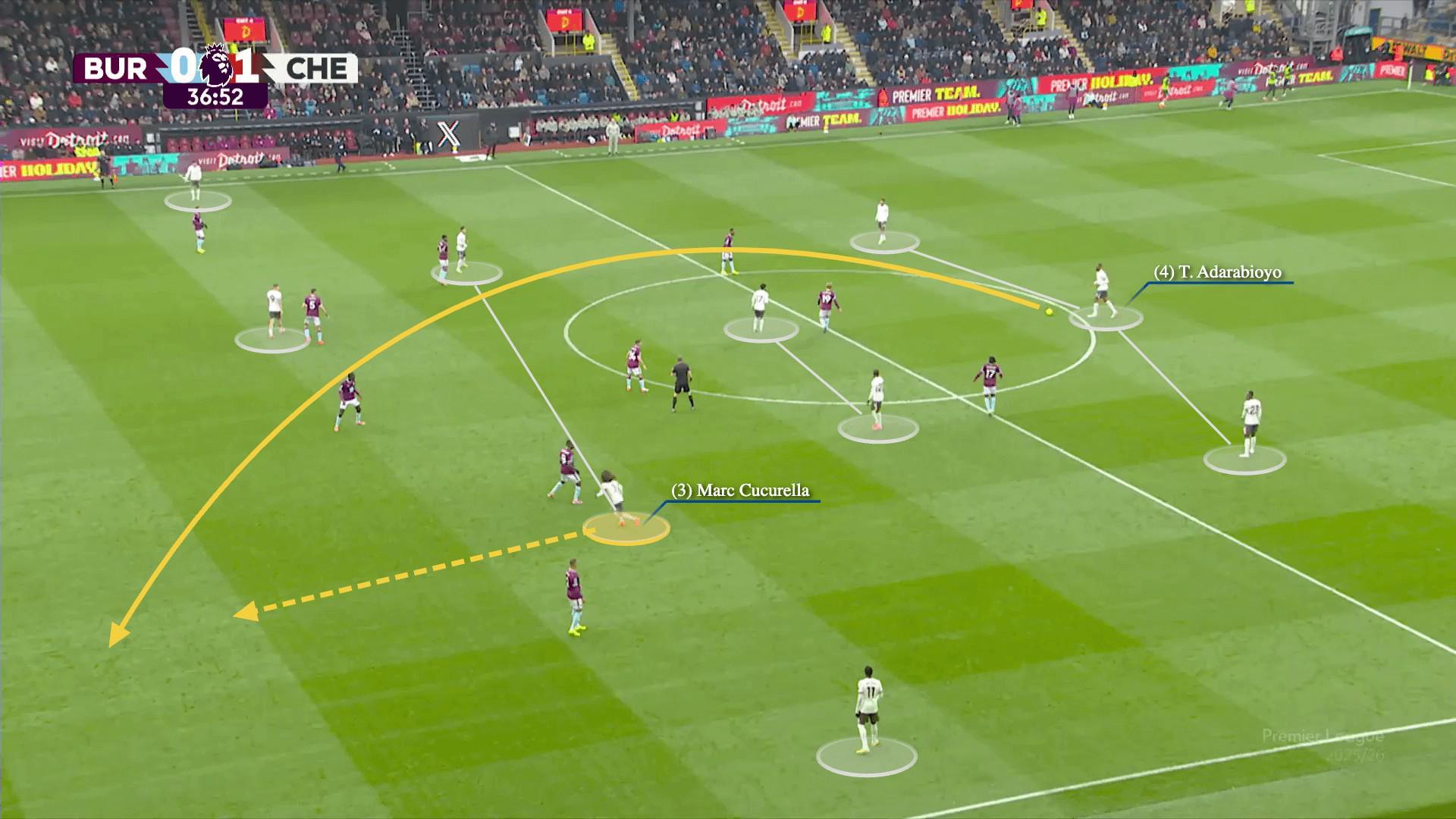 这次进攻包含了切尔西形成菱形中场时的四名中场中的三位。中卫韦斯利-福法纳将球传给9号位马克-吉乌,从而分开了中场,吉乌再将球做给10号位若昂-佩德罗。